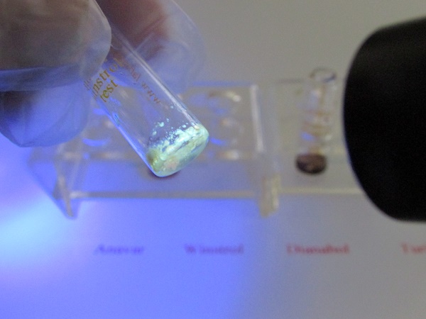 You need 365 nm UV light to watch fluorescence with this test. Notice the difference between the two tests, the regular one is using yellow reagent while the UV test white transparent reagent. Compared to regular test it is not critical to drop exact amount of powder or grinded pill to interpret the results, the regular test requires precise 1 mg to properly read the results. Do not drop more than the amount of test reagent inside, just a little bit if you drop a lot it might be impossible to see the fluorescence. You drop only a little powder, grinded pill. You have only 0.1 ml of the test reagent the same what you see on the video and on the pictures. It is corrosive and you do not need more, 0.1 ml is more than enough for the test.