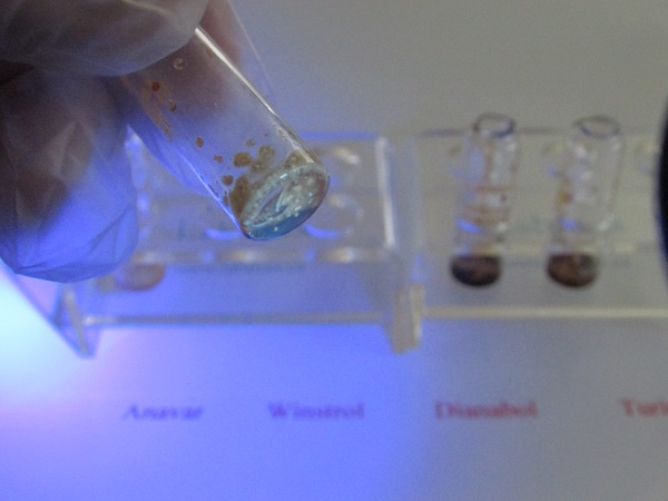 You can also test liquid form, which is impossible with regular test. You can also test raw powder, which is almost impossible with regular test to drop 1 mg of pure powder. Also larger pills can be also easily tested you cut a little with razor blade and drop inside. Just make sure you do not drop too much, the filler, usually corn starch will suck the entire test reagent and it might be hard to spot the fluorescence. Also if protein powder is used as filler or vitamins added those ingredients unlike with regular test will not interfere with test results. The only substances which can interfere are other steroids and some organic substance, which were added to your sample. The pharmaceutical form uses neutral fillers like corn starch which work perfectly with this test. Pharmaceutical companies never add anything to the pill like vitamins, proteins or anything else organic because it can interfere with the medication. Anything like pill dye does not influence the test results; color dye is simply dissolved by the test reagent. The color coding is easy to interpret.