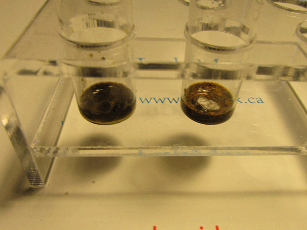 initial color change in vial 1, green to darker green, vial 2 red to darker red.