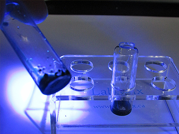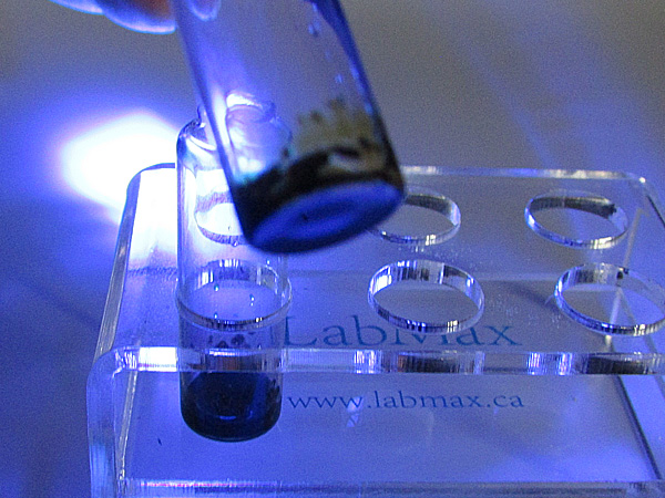 We use 2 special test vials. We add only a little of grinded pill less that the amount of test reagent. There is only 0.1 ml of test reagent in each vial. The initial color change in test vial A is green getting darker green. The initial color in vial test 2 is red getting darker red.