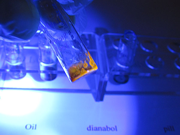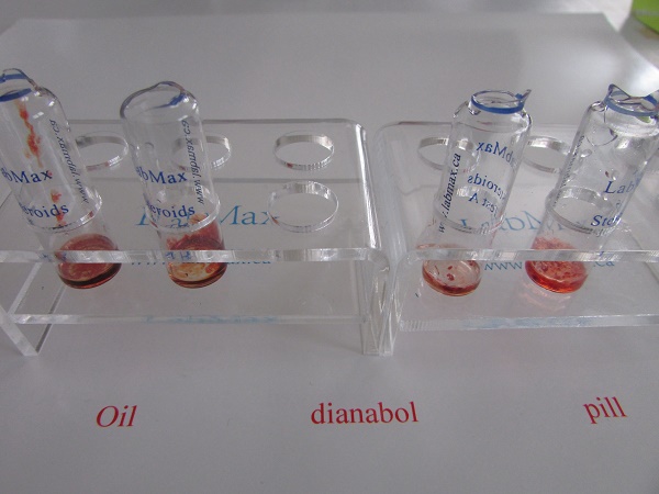 Although the red transparent color in both vials is very characteristic for dianabol, the results will not be complete without UV test.