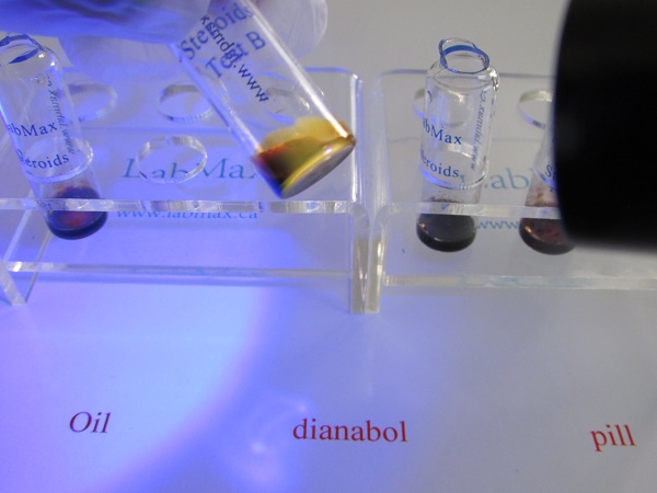 You drop only a little of the liquid if you use syringe it can anything from one to a few drops no more than the amount of test reagent inside the test tube. You can see that the initial color in both vials is red it is good indication of presence of dianabol (Methandrostenolone). It looks like pill version. Let’s see how it looks under UV light (365 nm) if it gives any fluorescence. You can see that the color under UV light changing is from red to yellow. The red color in both vials is not indication yet if dianabol is present you need to do the UV test.